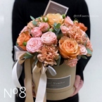 Белоснежные цветы в коробке натурального цвета. В составе: розы, эустома, скабиоза, зелень.