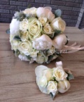 Белоснежные цветы в коробке натурального цвета. В составе: розы, эустома, скабиоза, зелень.