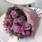 Букет с красными розами, ягодами гиперикума и рубуса, альстромерией и зеленью.