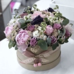 Милая нежная композиция с пионовидными розами, альстромерией, коробочками хлопка и венчиками лагуруса. Возможно исполнение в трех размерах.