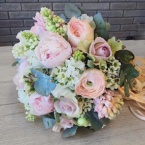 Если Вы хотите подарить нежный букет с розами, то Вам подойдет "Клубничный коктейль" из коллекции Shabby. Пепельно-розовые розы и гермини, окруженные взбитыми сливками гортензии и воздушной пеной вероники, выглядят очень празднично и вкусно.